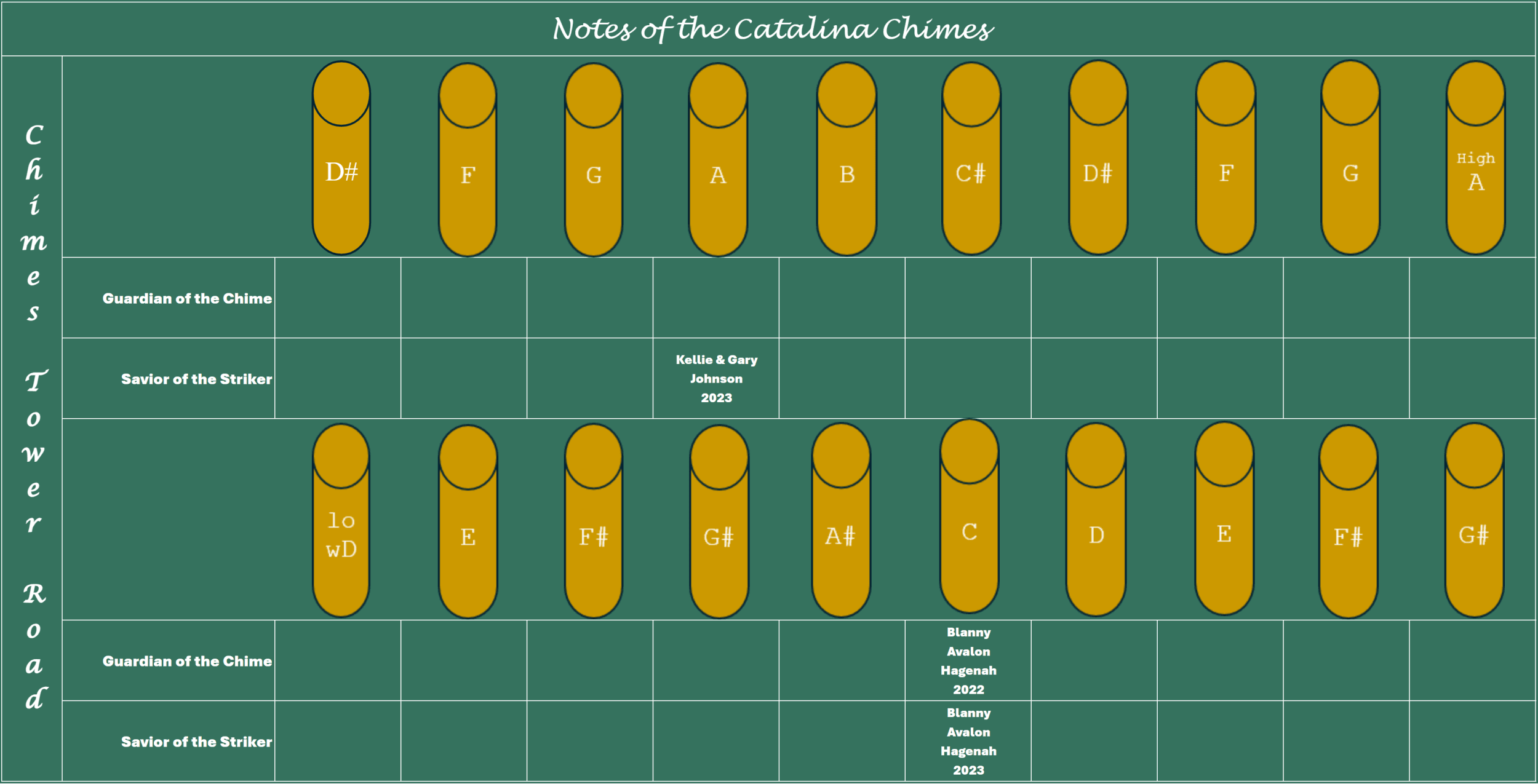 Your donation assigns full guardianship of one of 20 tubular bells of your choice for life. You will be recognized as a "Guardian of a Chime" on our website and in other announcements as our chimes restoration unfolds. Thank you for taking care of our precious chimes!